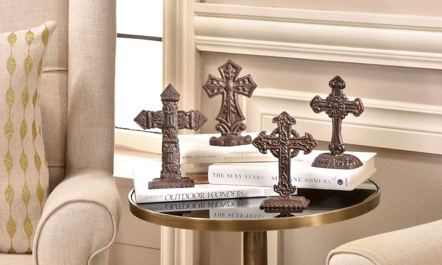 Rustic brown cast iron table cross with ornate textural detailing. Price is for one (1) cross.